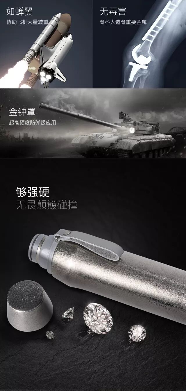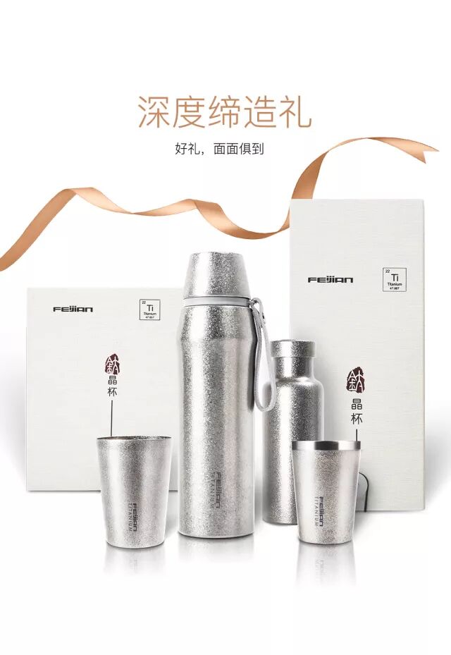 钛重量轻、硬度大、钛晶杯表面经过特殊处理,形成了一层具有极强人体亲和力的抗氧化薄膜,使得钛成为了打造健康杯壶的首选。